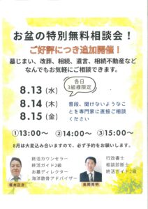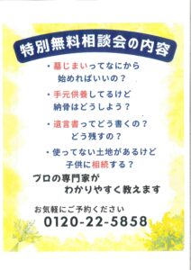 終活に関する無料相談会のご案内 — 安心の未来を築くために 観世音陵苑はなみずきでは、人生の節目に向き合う大切な時間として、「墓じまい・改葬・遺言・相続」に関する無料相談会を開催しております。お墓のお引越しや永代供養、家族への想いをかたちにする遺言作成、そして将来の相続手続きへの備えなど、複雑で不安の多いテーマを専門スタッフが個別に丁寧にご案内いたします。
