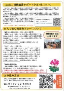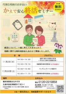 納骨堂観世音陵苑はなみずきのホームページへご訪問いただきありがとうござきます。 下記の通り、『かえで安心終活セミナー ‐円満な相続のお手伝い-』を開催いたします。 終活について、一緒に考えてみませんか?セミナー終了後、無料相談会も実施いたします。